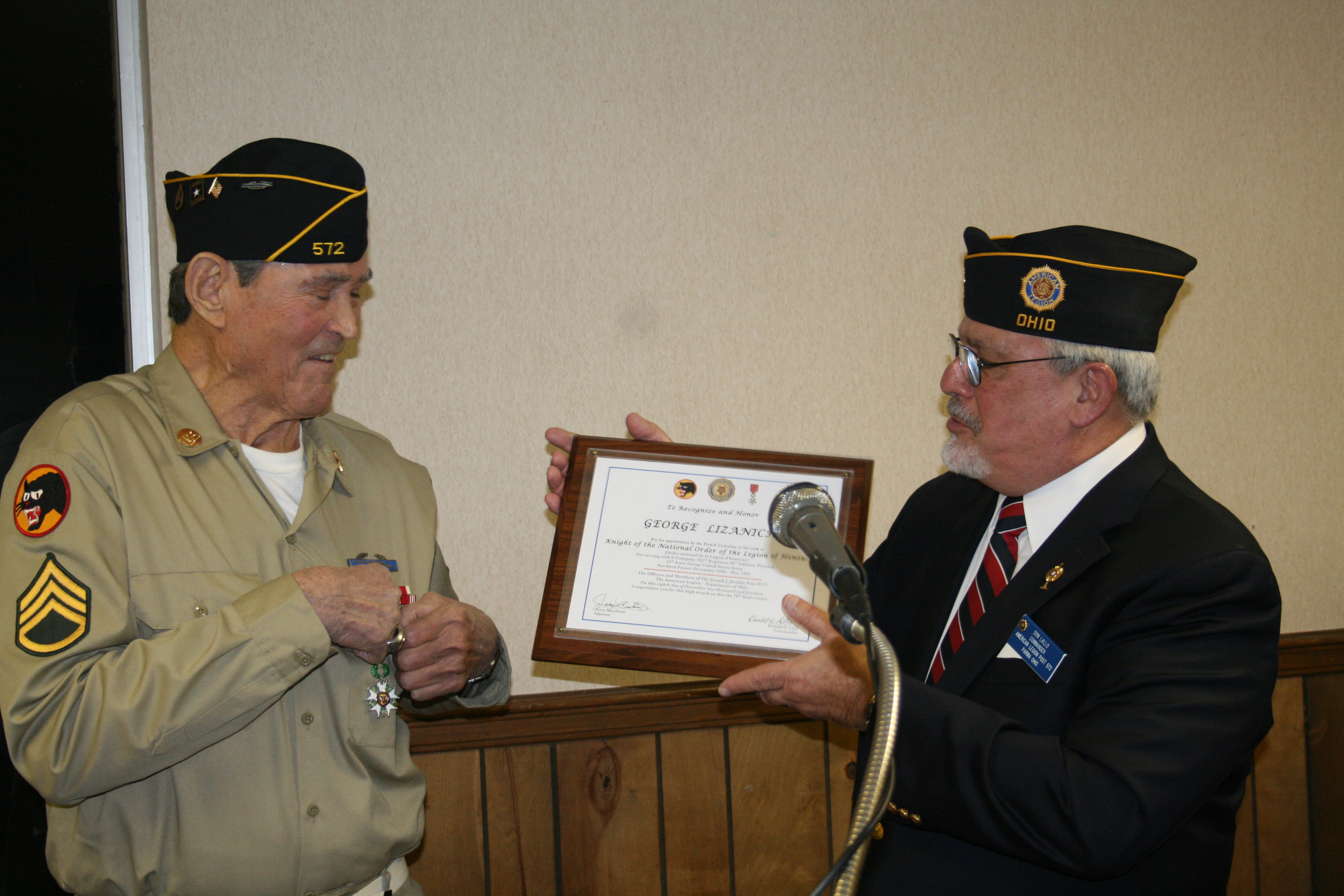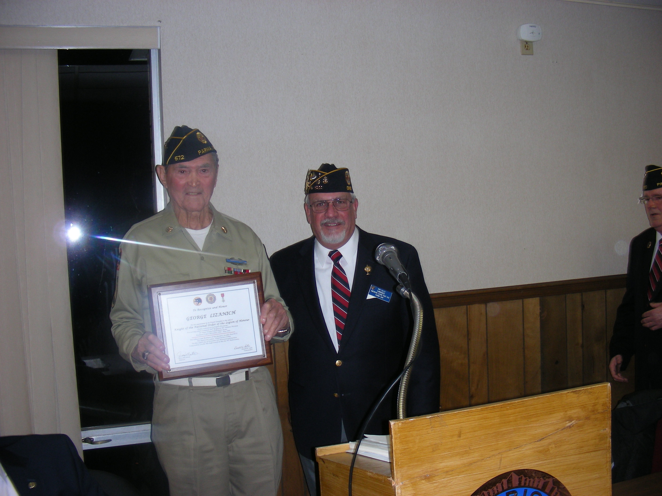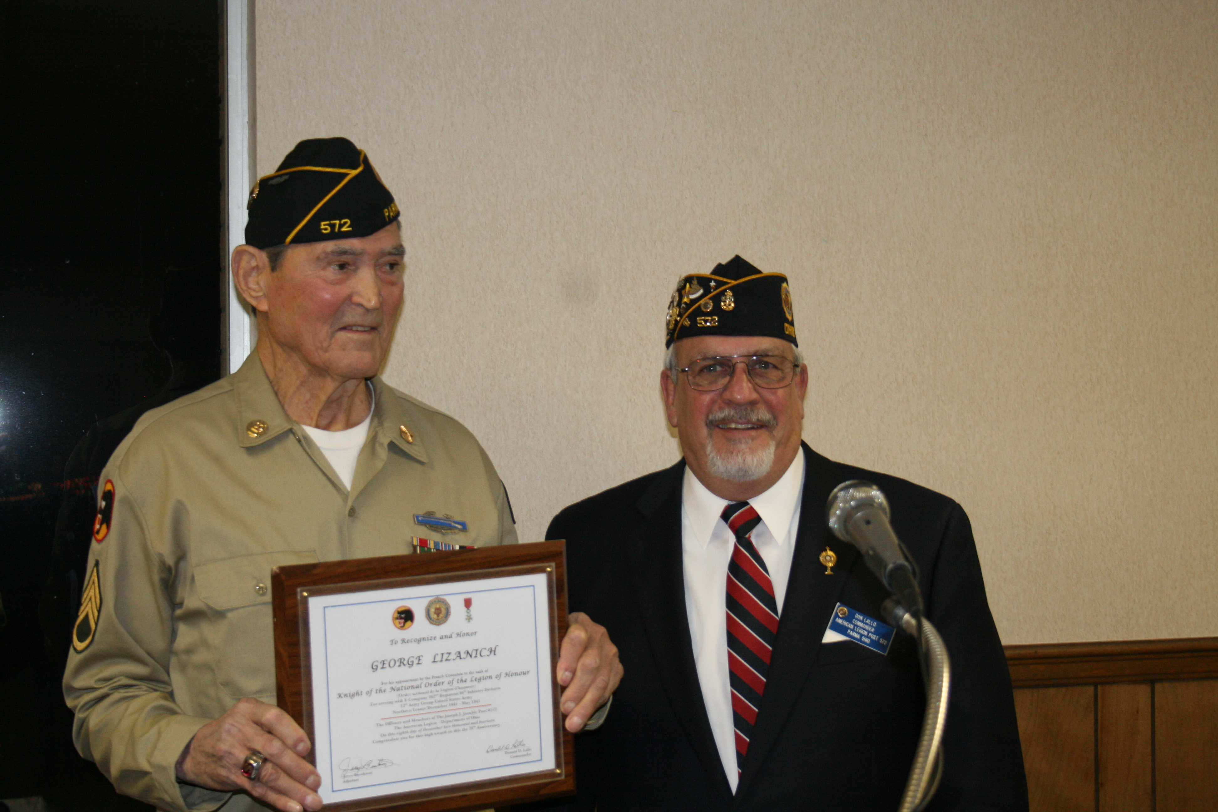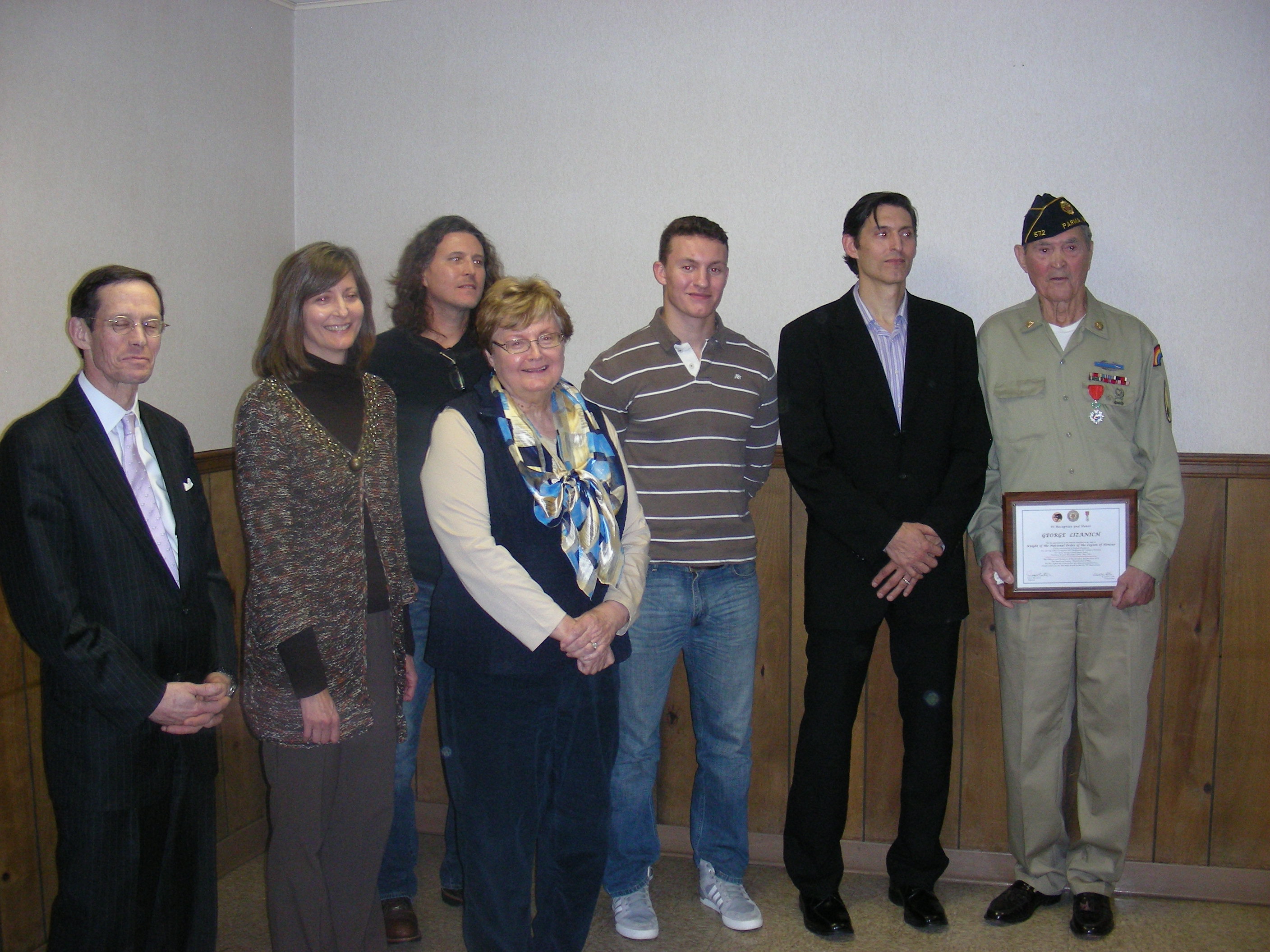 | Knight, The National Order of The Legion of Honor was presented by the Honorary Consul of France Stephen "Josh" Knerly representing The Republic of France to George Lizanich for his actions to liberate France while serving in the 66th Division in Northern France December 1944 to May 1945 Ceremony was conducted at Post 572 on December 8, 2014 |