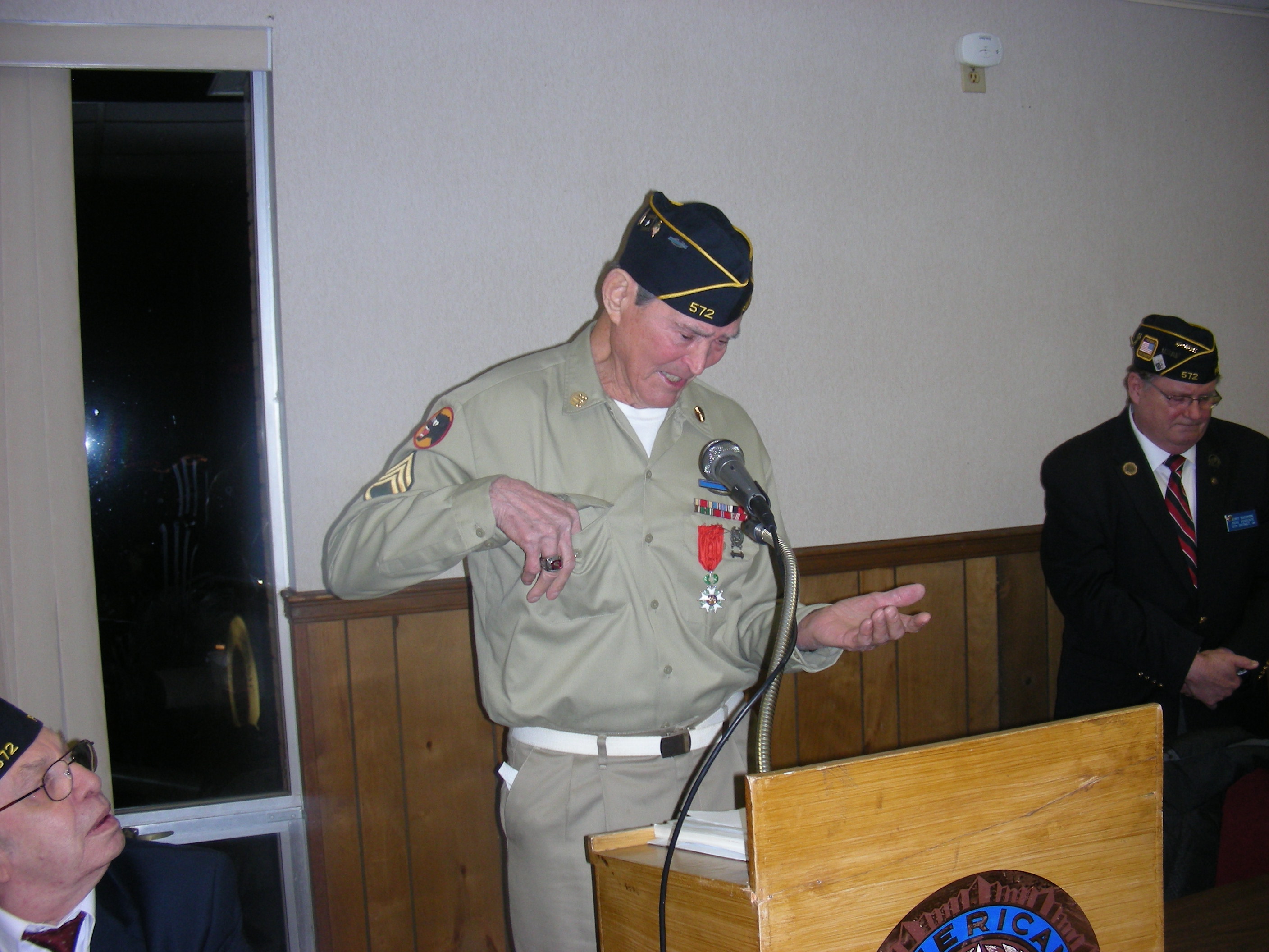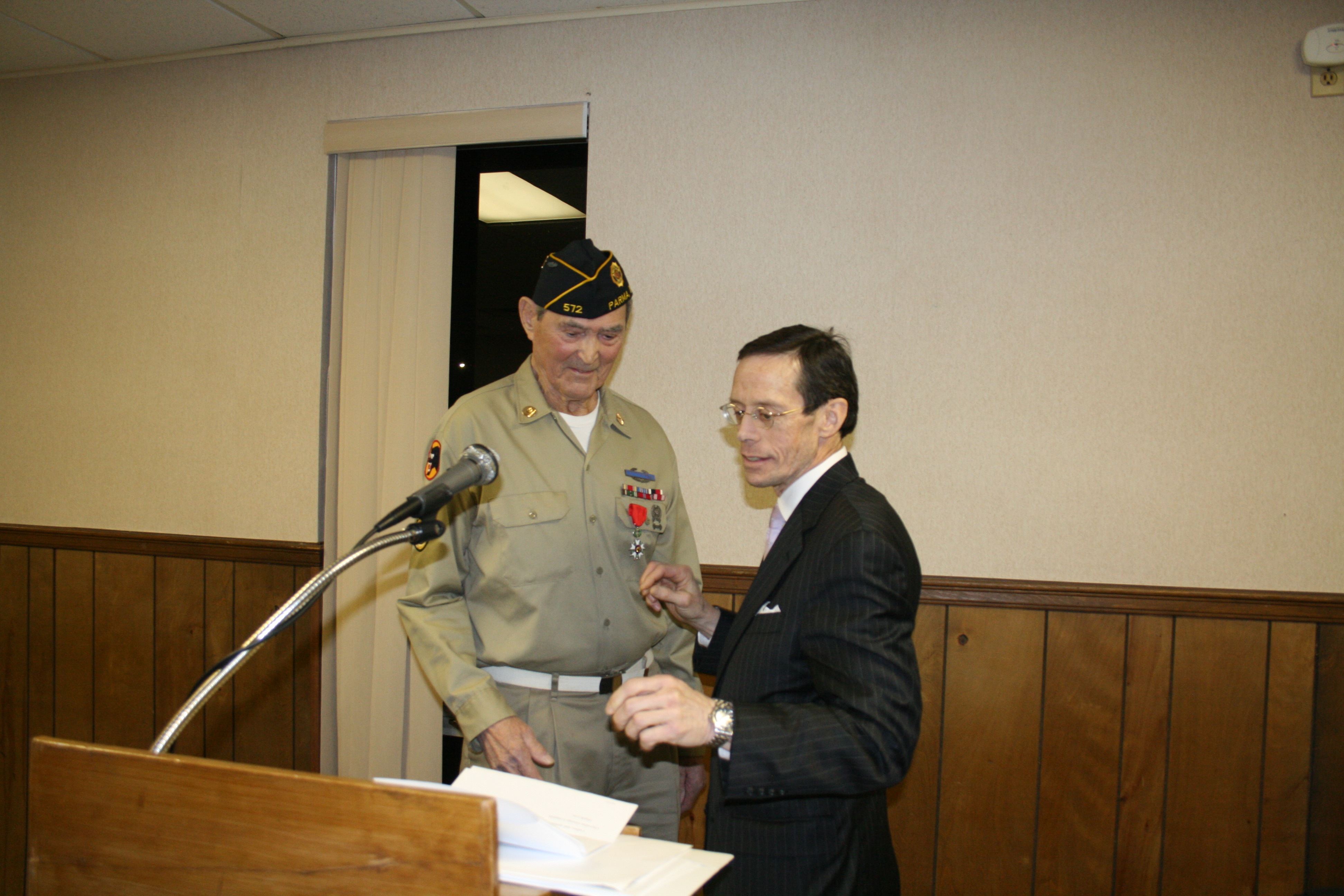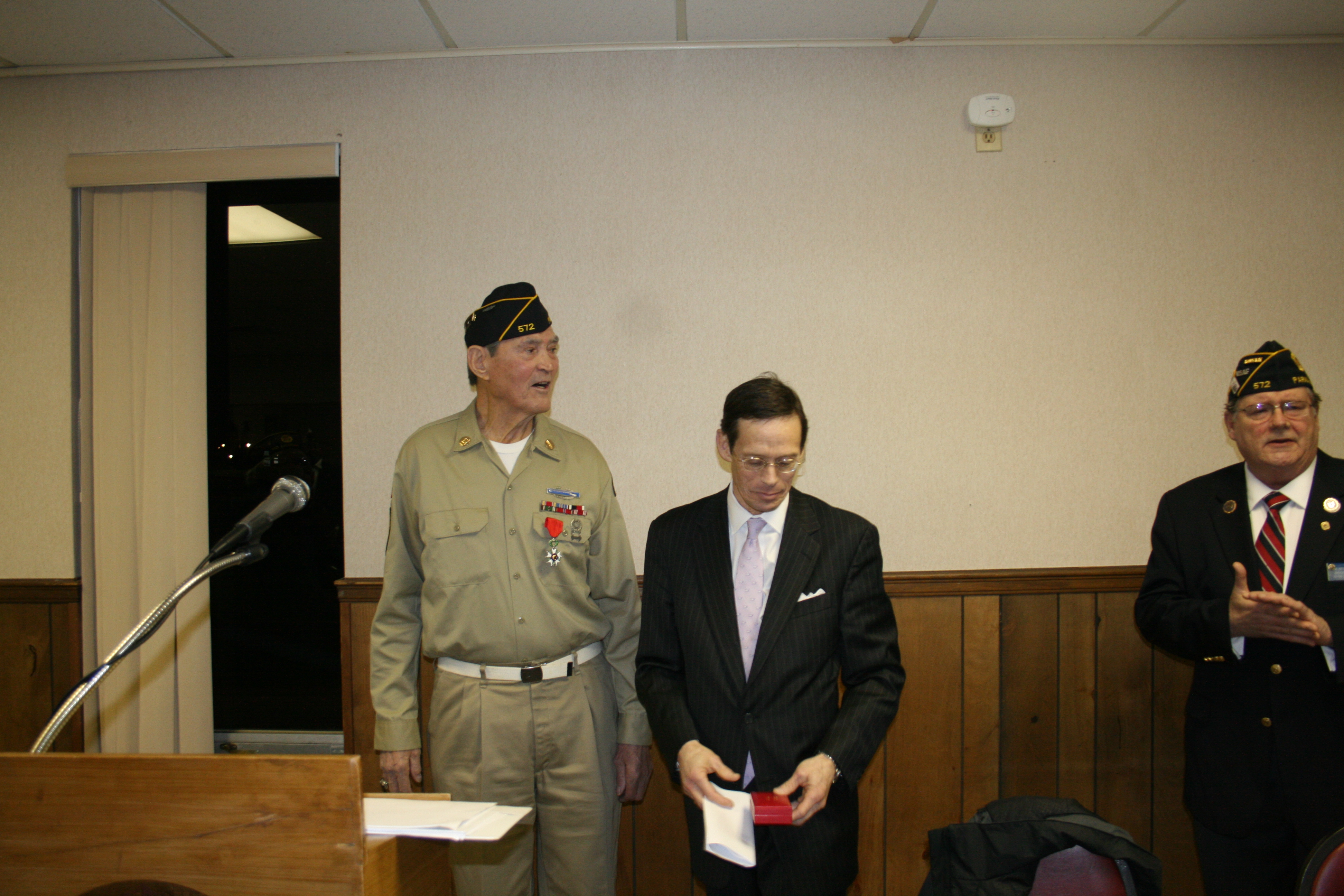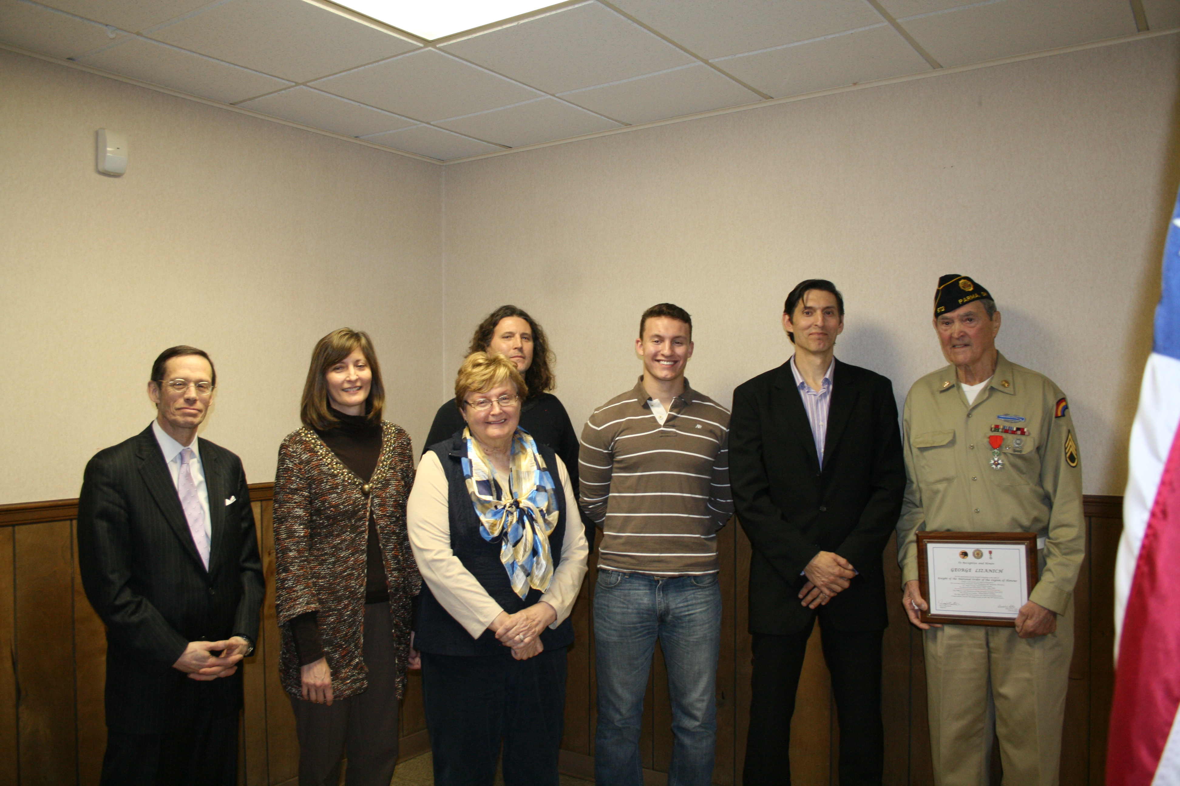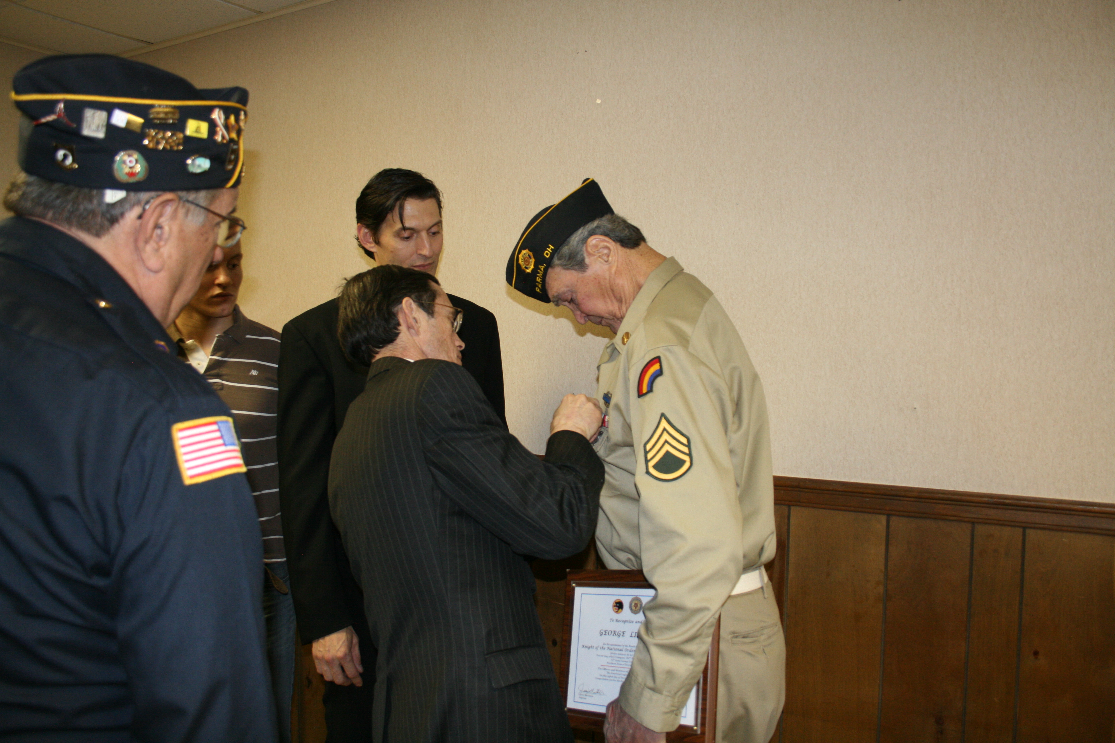 | Knight, The National Order of The Legion of Honor was presented by the Honorary Consul of France Stephen "Josh" Knerly representing The Republic of France to George Lizanich for his actions to liberate France while serving in the 66th Division in Northern France December 1944 to May 1945 Ceremony was conducted at Post 572 on December 8, 2014 |